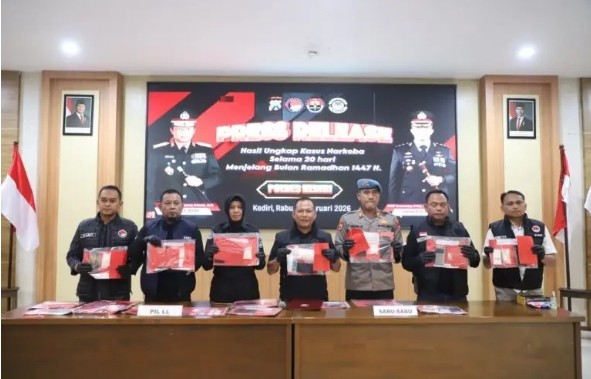 Sejak 28 Januari hingga 19 Februari 2026, Polres Kediri Polda Jatim berhasil mengungkap sebanyak 22 kasus narkoba dengan total 26 tersangka. 19 orang berperan sebagai pengedar dan 7 orang sebagai pemakai. Lima tersangka merupakan residivis kasus serupa.